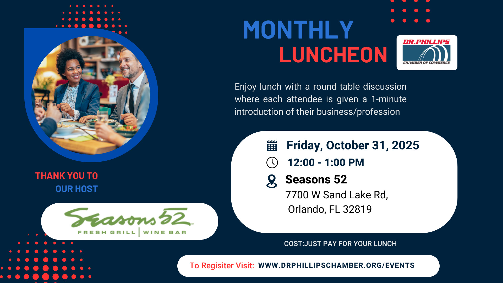 Friday Monthly Luncheon ๐Ÿฝ๏ธ Letโ€™s Do Lunch with the Dr. Phillips Chamber of Commerce! ๐ŸŒŸ Make meaningful connections and grow your business at our fun and productive monthly luncheon! ๐Ÿ“ˆ๐Ÿค โœจ What to Expect: ๐ŸŒŸ A friendly roundtable format with a 1-minute spotlight to share your business ๐ŸŒŸ A 10-minute presentation by a member to […]